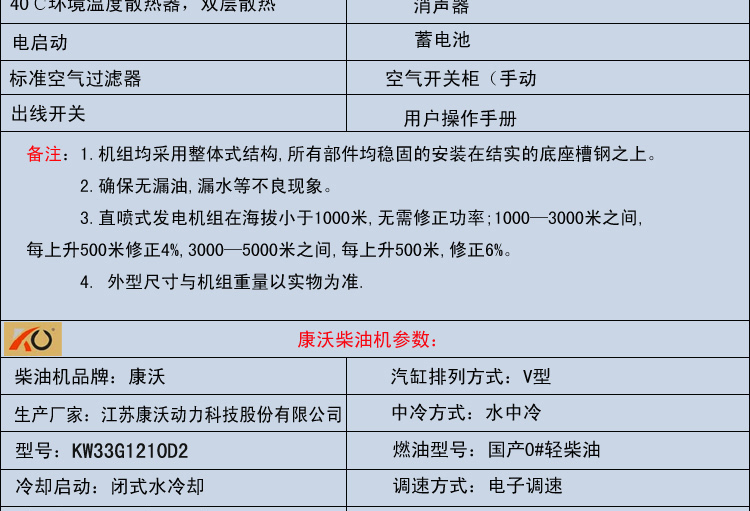3.直噴式發(fā)電機(jī)組在海拔小于1000米,無需修正功率;1000—3000米之間,每上升500米修正4%,3000—5000米之間,每上升500米,修正6%。