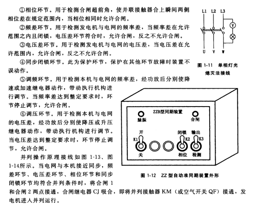① 要認真檢査同期裝置各儀表工作是否正常,兩只電壓表和兩只頻率表的準確度應基本 一致,無卡殼現象,以免發生儀表指示誤差。