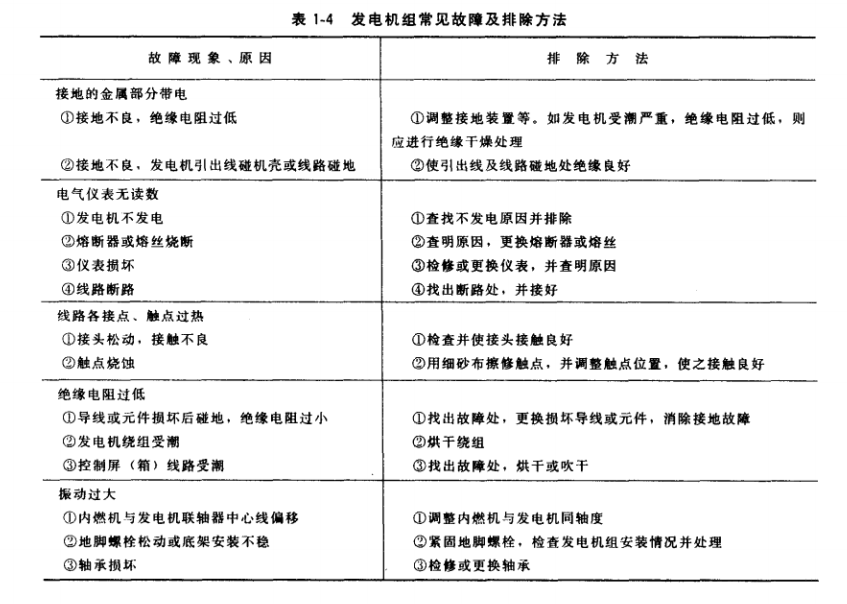 發電機組常見故障現象、原因及排除方法見表1-4。
