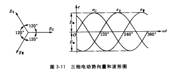(3) 三相交流電的產生。圖3-9所示發電機定子鐵心梢中,沿圓周均勻安置彼此相隔 120°電角度的3個相同繞組U1U2、V1V2、W1W2,稱為三相繞組。當轉子旋轉時,便可在三相繞組中感應出彼此相隔120°電角度的交流電動勢印、eu、ev、ew,其向量和波形如圖3-11 所示。