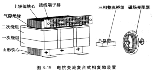 這種發電機在圖3-4所示有刷三相交流發電機基本結構基礎上配置一套電抗變流復合式相復勵裝置,其外形如圖3-19所示,它包括電抗變流器、三相整流橋組和磁場變阻器。作為可控相復勵裝置,還必須外配加裝一個分流式自動電壓調節器(STL)小功率發電機可不配分流式自動電壓調節器,電壓性能可滿足使用要求。