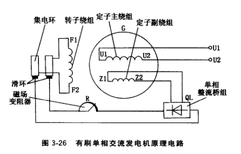 有刷單相交流發(fā)電機原理電路如圖3-26所示。由勵磁電源輸出的直流電(勵磁電源一 般來自定子副繞組感應(yīng)的交流電經(jīng)整流成的直流電)向轉(zhuǎn)子磁極繞組提供勵磁電流。發(fā)電機由內(nèi)燃機驅(qū)動至空載轉(zhuǎn)速,依靠轉(zhuǎn)子磁極鐵心的剩磁磁場(新機或經(jīng)大修的舊機須經(jīng)充磁后,磁極鐵心才有剩磁磁場),在定子繞組中感應(yīng)出交流電,由于定子梢中嵌人的繞組是單相繞組,因而感應(yīng)的是單相交流電壓。調(diào)節(jié)磁場變阻器或自動電壓調(diào)節(jié)裝置的電位器,可使發(fā)電機空載電壓整定在額定電壓值。
