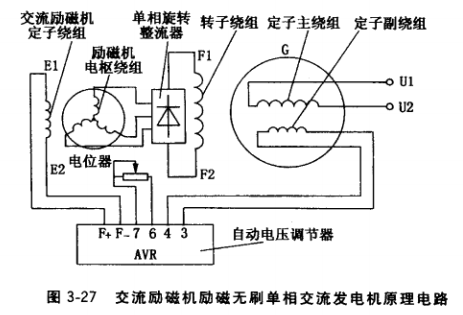 流發(fā)電機(jī)基本相同,不同之處在于定子鐵心槽中的定子主繞組是單相而不是三相,且定子主繞組、副繞組結(jié)構(gòu)與有刷單相交流發(fā)電機(jī)相同,此時(shí)定子副繞組的作用是向交流勵(lì)磁機(jī)定子 磁極繞組提供勵(lì)磁電流。
