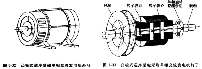 凸極式逆序勵磁無刷單相交流發電機整機原理電路如圖3-34所示。發電機由內燃機驅動至空載轉速,依靠轉子鐵心的剩磁磁場,定子副繞組Sc感應電壓,流過的容性電流產生單相脈動磁場。它可分解為順序和逆序兩個旋轉磁場,逆序磁場的旋轉速度與轉子轉速相等,但方向相反,在轉子繞組上感應出2倍發電機額定頻率的交流電流,經整流后向轉子繞組提供直流電流(勵磁電流〉,建立轉子主磁場;順序磁場旋轉速度與轉子轉速相等,且方向相同,對轉子主磁場起助磁作用。由于定子副繞組流過的是容性電流,容性電流的磁場對 轉子主磁場也起助磁作用。逆、順序磁場共同 作用,在定子主繞組上感應出空載電壓,實現 發電機自勵建壓。只要定、轉子各繞組參數設 計合理,在空載轉速下,定子主繞組感應的電 壓便可達額定值。定子主繞組Mc1,和Mc2串聯 時發電機輸出230V電壓,并聯時輸出115V 電壓。發電機負載時,其工作原理與隱極式逆 序勵磁單相交流發動機基本相同。
