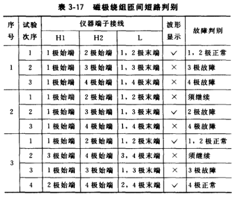 當測得波形異常而斷定繞組匝間有短路時,還必須査找短路發生在哪一相或哪一磁極, 則可按表3-16的接線,分別檢測U、V相,V、W相,W、U相,或1、2極,2、3極,3、 4極,4、1極的波形。匝間短路可按表3-16和表3-17判別。