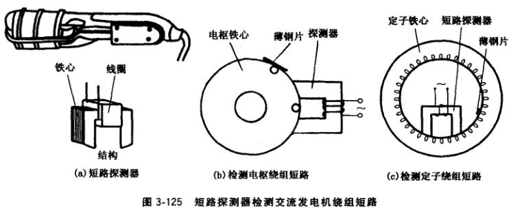 短路探測器是由Ⅱ形硅鋼片疊裝成鐵心(鐵心應疊壓整齊結實),鐵心上再繞線圈而成, 見圖3-125a。圖3-125b為檢測電樞繞組匝間短路示意圖,圖3-125c為檢測定子繞組短路示意圖。檢測時把探測器鐵心緊貼在電樞鐵心外周面上,通入交流電,鐵心中產生的交變磁 通,通過電樞鐵心形成磁回路。此時若在電樞鐵心槽口放一薄鋼片,則在交變磁場作用下, 薄鋼片被時吸時放,發出“吱吱”響聲。探測器繞電樞鐵心移動一圈,當在探測器附近移動的薄鋼片發出異響時,薄鋼片所處的電樞鐵心槽內繞組短路。檢測定子繞組有否短路時,把探測器緊貼在定子鐵心內周面上,繞周面緩移一圈,當在探測器附近移動的薄鋼片發出異常響聲時,薄鋼片所處的定子鐵心槽內繞組短路。