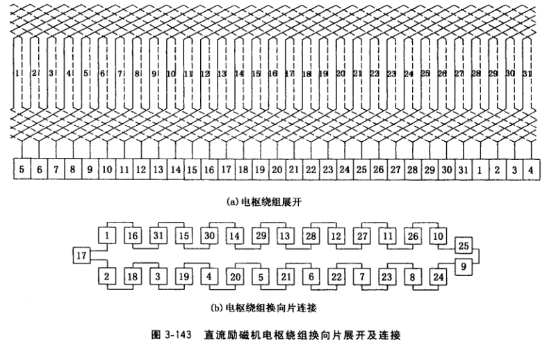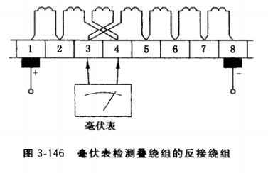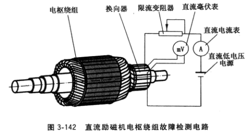 ①電樞繞組短路。用毫伏表測量每相鄰兩片片間電壓,當出現兩處,例如14、15片間 和30、31片間電壓讀數很小,根據圖3-143b即可斷定15與30片間電樞繞組短路。