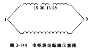 ①毫伏表的一端接于換向片1,另一端按圖3-144b中由近到遠的16、31、15……逐片測量電壓,未斷線的部分均無讀數,直至某一片(如圖3-144中片28)有讀數時,表明該換向片以外的電路與換向片1無斷路,且有加于1、 9片的剩余電壓,可斷定片28左邊有斷路。