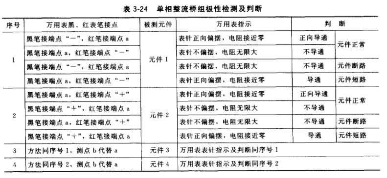 單相整流橋組極性簡易檢測及判斷方法見表3-24。按圖3-156d電路逐個檢測整流元件是否正常(檢測前交流側、直流側各1個接點應拆離外電路)。