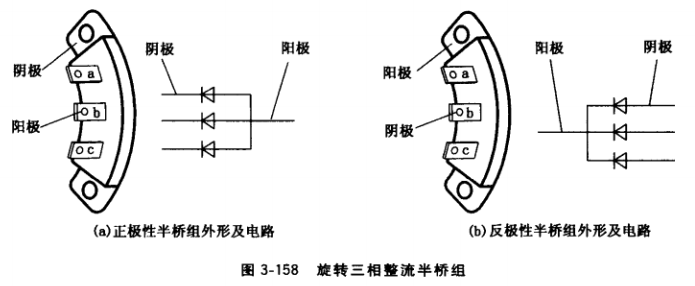 (2)旋轉三相整流橋組。用于無刷發電機,為了安裝方便,一般做成旋轉三相半橋組,如圖3-158所示。三相半橋組又有正極性和反(負)極性兩種,正極性的底板端為陰極,3個接線片為陽級,如圖3-158a所示。反極性三相旋轉整流半橋組底板端為陽極,3個 接線片為陰極,如圖3-158b所示。