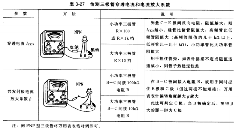 (5)三極管。三極管管腳極性識別和性能檢測,除用晶體管特性圖示儀外,也可用萬用表。檢測時不宜用萬用表的RX1擋,這擋內阻較小,流過三極管電流較大;也不宜用RX 10k擋,這擋電壓較高,可能會損壞一些低反壓三極管。測大功率三極管可選用RX 10擋。 此外,僅用萬用表只能大致定性估計三極管一些參數的情況。詳見表3-27。有的萬用表上 有HFE擋,可用來測定小功率管的電流放大系數β。
