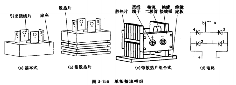 發電機常用的單相整流橋組基本結構有3種,如圖3-156所示。4個整流元件按單相橋式整流電路連接后,固封于底座殼內,為基本式(見圖3-156a); 4個整流元件按單相橋式整流電路連接后,固封于帶散熱器的底座內(見圖3-156b); 4個整流元件分別裝在4個散熱片上,經前后2個絕緣接線板及絕緣底板組合后,連接成單相橋式整流電路,交、直流接線端子分別設置在前后絕緣接線板上(見圖3-156C)。以上3種整流橋組外形、結構不同, 但其中4個整流元件連接成的單相橋式整流電路(見圖3-156d)是相同的。