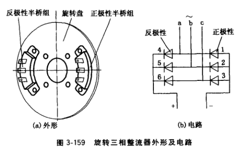 旋轉三相整流器可由6個旋轉整流元件固定在旋轉盤(絕緣盤)上,但目前無刷發電機用旋轉三相整流器更多的是由正極性和反極性旋轉三相整流半橋組各1個安裝在旋轉盤上組合而成,其結構及電路如圖3-159所示。