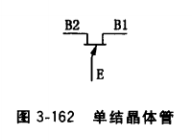 (4)單結晶體管。單結晶體管有一個發射極E和兩個基極B1、B2 (見圖3-162),所以又稱為雙基極二極管,發射極E與第一基極B1和第二基極B2都是PN結關系,因此,可按整流二極管檢測方法檢測。用萬用表RX100擋,測量E對B1和E對B2的正、反向電阻,正常時正向電阻均為∞,反向電阻為0,否則說明管子已損壞,反向電阻很小則說明穿透電流過大或已損壞。