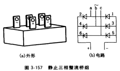 (1)靜止三相整流橋組。它由6個整流元件連接成三相整流電路后固封于底座殼內,引出5個接線片,其中3個交流側接線 片標志為“?”,2個直流側接線片分別標志 為“ + ”、“ - ”如圖3-157a所示。其電路 見圖3-157b。