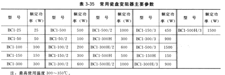 (8)常用瓷盤變阻器及其電阻主要參數見表3-35。
