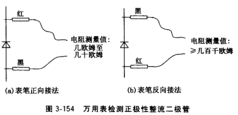 (1)用萬用表檢測整流二極管極性和二極通、斷。由于萬用表上黑表筆的插口與萬用表內的電池正極相連,紅表筆的插口與萬用表內的電池負極相連, 因此,可根據圖3-154檢測。當萬用表黑表筆接觸二極管底座,紅筆接引線端時(見圖a),整流二極管應處于正向導通狀態,萬用表表針正向偏擺,指示幾歐姆至幾十歐姆;當黑、紅筆與二極管反接時(見圖b),二極管處于反向截止狀態,指示值大于幾百千歐姆,表示該元件為正極性二極管,無短路、無斷路。當萬用表仍然是黑表筆接觸二極管底座,紅筆接引線端時,但指示的電阻值卻與上述相反,則表示該元件為反極性二極管。