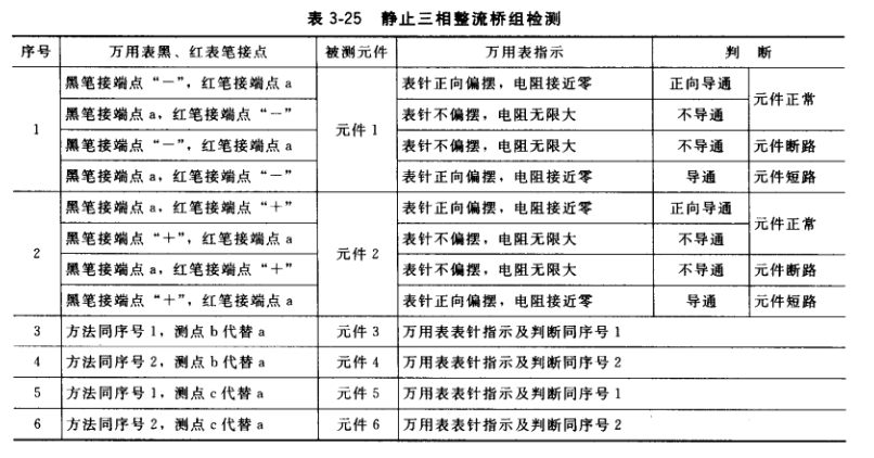 靜止三相整流橋組簡易檢測及判斷方法見表3-25。按圖3-157b逐個檢測整流元件是否正常(檢測前交流側、直流側各1個接點應拆離外電路)。