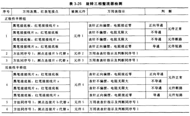 旋轉三相整流橋組簡易檢測及判斷方法見表3-26。按圖3-158逐個檢測整流元件是否正常(檢測前交流側、直流側各1個接點應拆離外電路)。