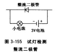 (2)用試燈檢測整流二極管。用3V電池及小電珠做成試燈測試 (見圖3-155),若燈亮,整流二極管正、負端對調連接時燈暗,說明該整流二極管是好的,無斷路、短路。若兩種接法時燈都亮,說明該元件已短路;若兩種接法時燈都暗,說明該元件已斷路,都應換上同規格新的元件。