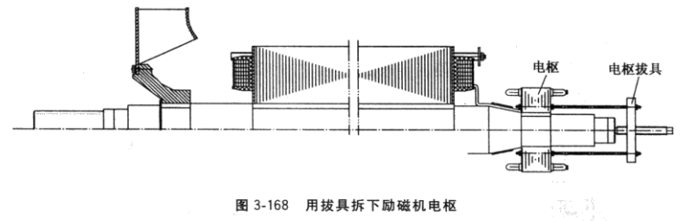 (8)拔出勵磁機電樞。勵磁機電樞一般位于轉子后端,可利用電樞鐵心軛部4個通孔,裝上4根長螺桿,用圖3-168所示電樞拔具,卸下電樞。