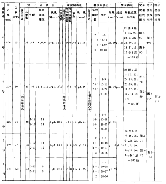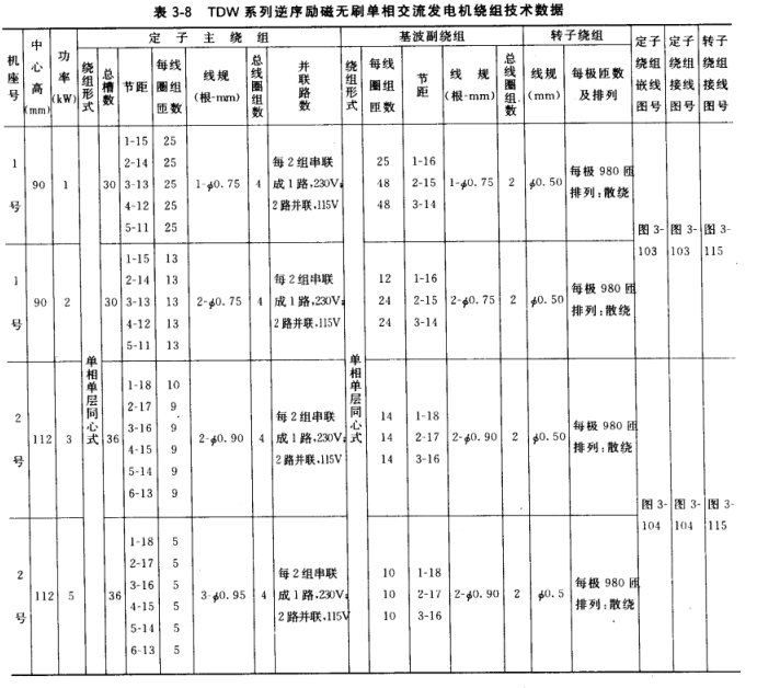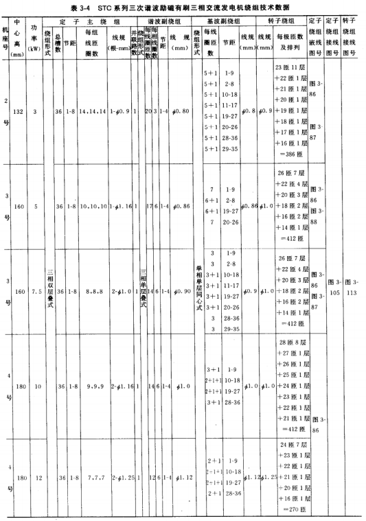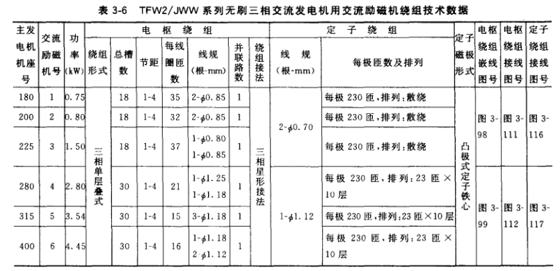 (1)繞組線規(guī)。小功率單、三相交流發(fā)電機(jī)轉(zhuǎn)子繞組一般采用漆包圓銅線,中等功率發(fā)電機(jī)一般采用漆包扁銅線。修理時(shí)根據(jù)交流發(fā)電機(jī)的型號(hào)、規(guī)格,從表3-3?表3-8中査找或采用實(shí)測(cè)法確定線規(guī)。
