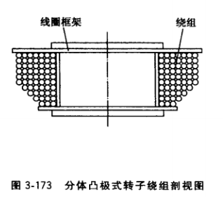 單、三相交流發(fā)電機(jī)凸極轉(zhuǎn)子繞組有兩種結(jié)構(gòu)形式:分體凸極式鐵心磁極繞組,其剖視如圖3-173所示,包括線圈框架和漆包線繞組;整體凸極式鐵心磁極繞組,其剖視如圖 3-174所示,包括磁極鐵心極身絕緣和漆包線繞組。