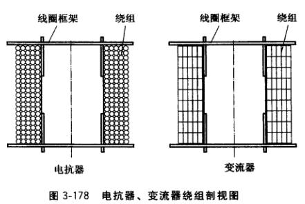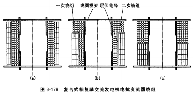 電抗移相式相復勵交流發電機線性電抗器、雙繞組電抗分流交流發電機電抗器主要由線圈框架、繞組等組成,其繞組剖視圖如圖3-178所示。三相電抗變流復合式相復勵交流發電機電抗變流器及單相相復勵交流發電機電抗變流器主要由線圈框架、一次繞組、二次繞組等組成。發電機運行時一次繞組通過的電流大,故一般采用漆包扁銅線或雙玻璃絲包扁銅線繞制。二次繞組通過的電流小,一般采用漆包圓銅線繞制。出于對線圈框架空間的有效利用,一次繞組和二次繞組排列有3種形式,見圖3-179。