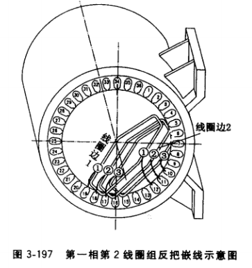 繞組嵌線從第一相開始,第一相第1線圈組的3個線圈邊2嵌入定子鐵心8、9、10號槽(見圖3-196),及時插入層間絕緣,此時該線圈組的3個線圈邊1 應懸掛在1、2、3號槽口上方。接著,嵌第二相第1線圈組,將其線圈邊2嵌入定子鐵心11、 12、13號槽,插入層間絕緣,該線圈組的線圈邊1應懸掛在4、5、6號槽口上方。繼而嵌第三相第1線圈組,將其線圈邊2嵌入定子鐵心14、 15、16號槽,插入層間絕緣,該線圈組的線圈 邊1應懸掛在7、8、9號槽口上方。之后繼續按上述方法嵌第一相的第2線圈組的線圈邊2于 17、18、19號槽中。由于前面8號槽起已有線圈邊2嵌入槽下層,此時第一相第2線圈組的線圈邊1可嵌入10、11、12號槽。接著,按槽順序嵌人第二相、第三相線圈邊2和線圈邊1, 直至每相的第3線圈組、第4線圈組均按順序嵌入相應槽中。