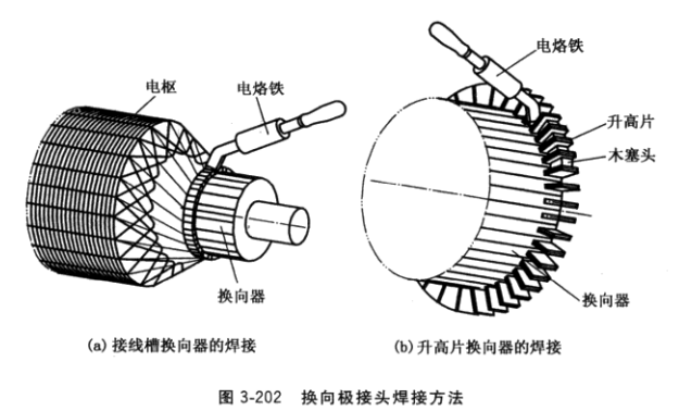 (2) 工藝準(zhǔn)備。調(diào)整電樞接頭片之間距離。采用接線槽的換向器,應(yīng)使接線槽垂直于換向器。采用升高片的換向器,升高片垂直于換向器且距離應(yīng)均勻。在升高片之間通常要敲入梯形(退拔)木塞頭,使升高片之間一般保留1/3升高片的高度的空隙,以便放電烙鐵頭, 如圖3-202b所示。將換向器升高片的外端面圓周銼平、銼光,并立即涂以松香溶液,防止銅皮產(chǎn)生氧化膜。焊接時(shí)絕不能讓電樞繞組引線頭高出換向器接線槽(接線槽必須加工有足夠深度)。