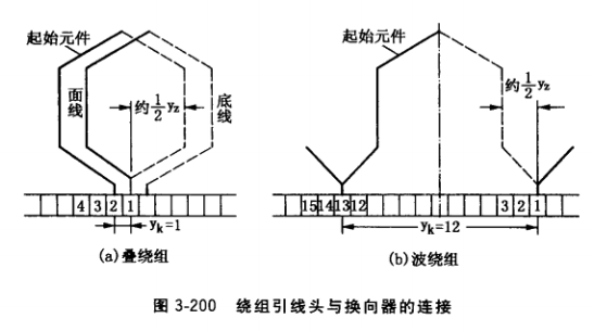 對(duì)單疊繞組換向器節(jié)距:yk = ± 1,兩引線嵌入相鄰兩換向片中。對(duì)單波繞組 yk= (k±1)/p(k為換向器片數(shù),p為主極對(duì)數(shù),±表示繞組為左行或右行)例如28槽4極單疊繞組,槽竹距yz = z/2p = 28/4 = 7 (即1?8),換向器節(jié)距:yk = +1。選擇某個(gè)元件作起始點(diǎn),把它的底線引線頭接到距元件有效邊向內(nèi)約yz/2處的換向片1上, 再按yk(1?2)將面線的引線頭連接到相鄰的換向片,如圖3-200a所示,其余元件依次類(lèi)推。