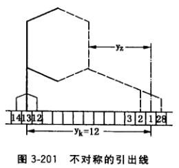 有時(shí)繞組的引線頭距離做成不對(duì)稱(chēng)的,如圖3-201所 示,它的底線引線頭伸出長(zhǎng)度比起一般的(見(jiàn)圖3-200b)長(zhǎng)得多,這種繞組多用在四極勵(lì)磁機(jī)中,因4個(gè)主極在垂直及 水平線上,所以把電刷位置改在換向極的中心線以便通過(guò)后端蓋上窗孔進(jìn)行觀察。