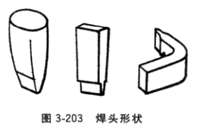 焊接時(shí)先將轉(zhuǎn)子稍向換向器端傾斜一些,防止焊錫流入電樞內(nèi)。對(duì)于采用接線槽的換向器,電烙鐵頭放在接線槽的頂部。如果一只電烙鐵熱量不夠,可用幾把電烙鐵同時(shí)加熱。當(dāng)接線槽達(dá)到一定的溫度后,可先在接線槽上加上適量焊劑,然后再加錫。有升高片的換向器,除了可用上述方法焊接外,還可將烙鐵頭銼成扁平狀(圖3-203), 使它能插入相鄰兩升高片間。先將烙鐵頭插入相鄰兩升高片木塞所留下空隙處,稍加些錫,再加些焊劑,最后再加錫。