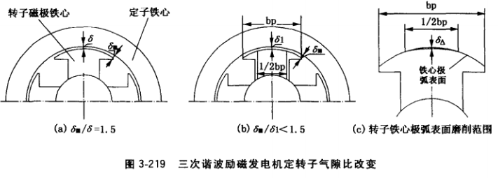 a.改變定、轉(zhuǎn)子氣隙比。圖3-219a為發(fā)電機(jī)原來定、轉(zhuǎn)子氣隙比為δm/δ=1.5的結(jié)構(gòu), 圖3-219b為改變轉(zhuǎn)子鐵心極弧表面尺寸的結(jié)構(gòu),在極弧表面1/2寬度的中央部分磨削δΔ= 0.2-0. 3mm (小功率發(fā)電機(jī)取小值,較大功率發(fā)電機(jī)取大值),使中央氣隙由δ增大為δ1, 其作用是減小氣隙比,使δm/δ1<1.5,最好能做到1.4或略小于1.4,可明顯增強(qiáng)氣隙磁場 中的三次諧波含量,發(fā)電機(jī)容易自勵建立電壓。