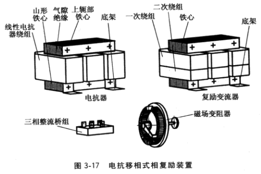 ⑤電抗器(見圖3-17)或電抗變流器(見圖3-19)的上軛鐵與山形鐵心之間氣隙太小甚至相碰,電抗值太大,發(fā)電機(jī)勵磁繞組得不到足夠的勵磁電流,無法建立電壓。