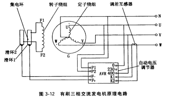 ⑥按圖3-12或圖3-16用萬用表檢測接至AVR的電源電壓(一般為交流230V)和檢測電壓 (—般為交流線電壓400V或抽頭線電壓200V),若不正常應(yīng)更正接線位置。