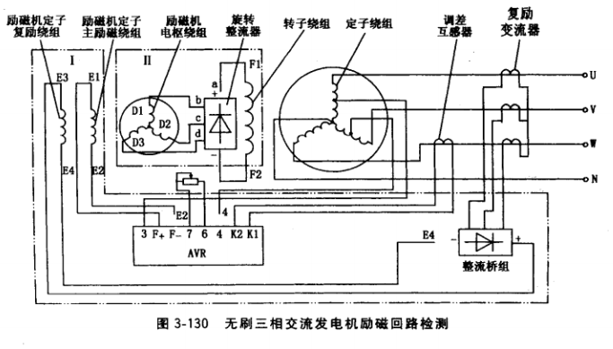 ③勵磁回路斷線或電氣接觸不良。無刷三相交流發(fā)電機(jī)勵磁回路見圖3-130中雙點(diǎn)畫線 框Ι和Ⅱ內(nèi)兩部分電路。框I部分包含定子繞組抽頭、AVR,勵磁機(jī)定子主勵磁繞組 E1E2、勵磁機(jī)定子復(fù)勵繞組E3E4及各段連接線??颌虿糠职瑒畲艡C(jī)電樞繞組、旋轉(zhuǎn)整流器、轉(zhuǎn)子繞組及各段連接線。勵磁回路任何一處斷線或電氣接觸嚴(yán)重不良,都導(dǎo)致勵磁電流無通路,發(fā)電機(jī)不能發(fā)電。