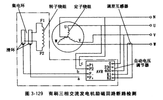 ②無勵磁電流。有刷三相交流發(fā)電機(jī)勵磁回路包含U相定子繞組、AVR或整流橋組、 集電環(huán)、轉(zhuǎn)子繞組F1F2及各段連接線(詳見圖3-129中雙點(diǎn)畫線框內(nèi)電路)。當(dāng)該回路斷線 或電氣接觸嚴(yán)重不良(如接線頭氧化、松脫,變阻器接線螺栓松動等)時,發(fā)電機(jī)無勵磁電流。