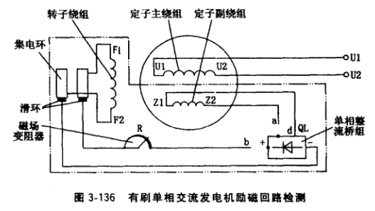 ⑦勵磁回路斷路或接觸不良。有刷單相交流發電機勵磁回路包含定子繞組、單相整流橋 組、磁場變阻器、集電環、轉子繞組F1F2及各段連接線(見圖3-136中雙點畫線框內電路)。當該電路斷線或電氣接觸嚴重不良(如接線頭嚴重氧化、松脫,變阻器接線螺栓松動 等)時,發電機無勵磁電流。
