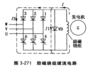 (2)原因分析。可控硅勵磁調節器的續流管開路 或通態正向電阻變大,脈沖突然消失,可控硅維持電流太小,正向阻斷電壓下降。因為可控硅整流橋的負載——發電機轉子是個大電感,通過它的電流是不能突變的。發電機運行中,當可控硅整流橋輸出的電壓過零時,轉子將產生一個與勵磁電壓極性相反的反電勢,通過續流管VD和二極管及未關斷的可控硅(如 W相二極管3和可控硅6)續流(如圖3-271虛線所示),續流電流I=I1+I2。在正常情況下,由于續流管的通態正向電阻小,續流電流基本上從續流管通過,流過二極管和未關斷可控硅的續流電流I2很小。但若續流管開路或通態正向電阻大,則續流電流全部或大部分從W相可控硅流過。當續流電流I2大于可控硅的維持電流時,可控砘將繼續導通.直至U相可控硅導通, 強迫其換相才能關斷。但此時若三相脈沖(或U相脈沖)突然消失,則W相可控硅關不斷,將一直導通到承受來自電源的正向電壓,接著全導通。如此循環,使可控硅完全失控, 成為不可控整流。