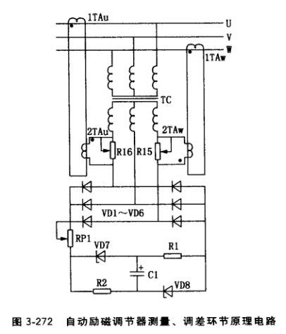 (2) 原因分析。可控硅勵磁調節器為了使發電機在并網運行時能合理分配無功,一般都 設有調差裝置,在接線上有單相調差、兩相調差和三相調差等。下面就以兩相調差為例說明接線錯誤引起無功電流一直上升的原因。圖3-272是勵磁調節器的測量、調差環節(調節器電路見圖3-53) 測量變壓器TC和測量橋VD1?VD6等組成了調節器的電壓測量環節。當發電機電壓上升時,測置橋輸出信號增大,此信號與比較橋(由R1、R2和VD7、VD8組 成)比較和放大器放大后,將使觸發脈沖后移,勵磁電流減小,從而使發電機電壓下降,恢復到接近原來的電壓值。相反,將使發電機端電壓增加,以維持發電機端電壓在一定范圍內。