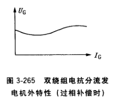 (2)原因分析。雙繞組電抗分流發電機一般副繞組滯后主繞組電角度10°,相補償作用強,使發電機的外特性(即發 電機電壓UG隨電流IG變化的特性)下凹上拱,如圖3-265所示。而不同發電機的外特性不一致,又無調差裝置供調節用,因此造成并列運行無功輸出不穩,無功分配困難。
