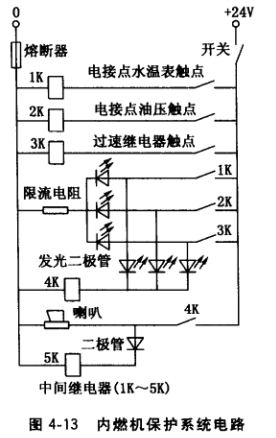 (1) 內(nèi)燃機(jī)保護(hù)系統(tǒng)。有高水溫、低油壓和超速保 護(hù),典型電路如圖4-13所示(有的內(nèi)燃機(jī)還有欠速、冷 卻水中斷、油溫高、燃油油面低、并列機(jī)組逆功率保護(hù) 等)。機(jī)組運(yùn)行中,一旦內(nèi)燃機(jī)出現(xiàn)高水溫、低油壓和超 速時(shí),電接點(diǎn)水溫表觸點(diǎn)、電接點(diǎn)油壓表觸點(diǎn)和過速繼 電器觸點(diǎn)閉合,繼電器1K、2K、3K得電動作,使其常開觸點(diǎn)閉合,一方面使發(fā)光二極管發(fā)出光報(bào)警信號,另 —方面使繼電器4K動作,喇叭發(fā)出聲報(bào)警信號,同時(shí)繼電器5K動作,機(jī)組立即自動停機(jī),起到了保護(hù)作用。 有的內(nèi)燃機(jī)設(shè)水溫表和油壓表,用于監(jiān)控其工作時(shí)的水溫和油壓。