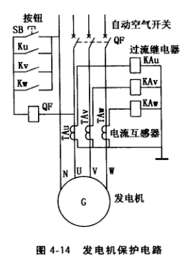 (2) 發(fā)電機(jī)保護(hù)系統(tǒng)。小型發(fā)電機(jī)由于容量小,所 以保護(hù)裝置比較簡單,一般用自動空氣開關(guān)中瞬時(shí)脫扣器和熱脫扣器來實(shí)現(xiàn)短路和過載保護(hù)(有的發(fā)電機(jī)還有過電壓、欠比、接地等保護(hù))。用戶訂貨時(shí)可對自動空氣開關(guān)的瞬時(shí)脫扣和熱脫扣的整定值提出具體要求,否則出廠時(shí)一般均按最大值整定,很難達(dá)到整定要求,起不到保護(hù)作用。因此有的廠家為了保護(hù) 可靠,另外加設(shè)了短路和過載保護(hù),如采用熔斷器作短路保護(hù),用過流繼電器作過流保護(hù)(見圖4-14)。有的廠家為了節(jié)省一個電流互感器,取消了 TAV,將Kv直接與中性點(diǎn)連接。