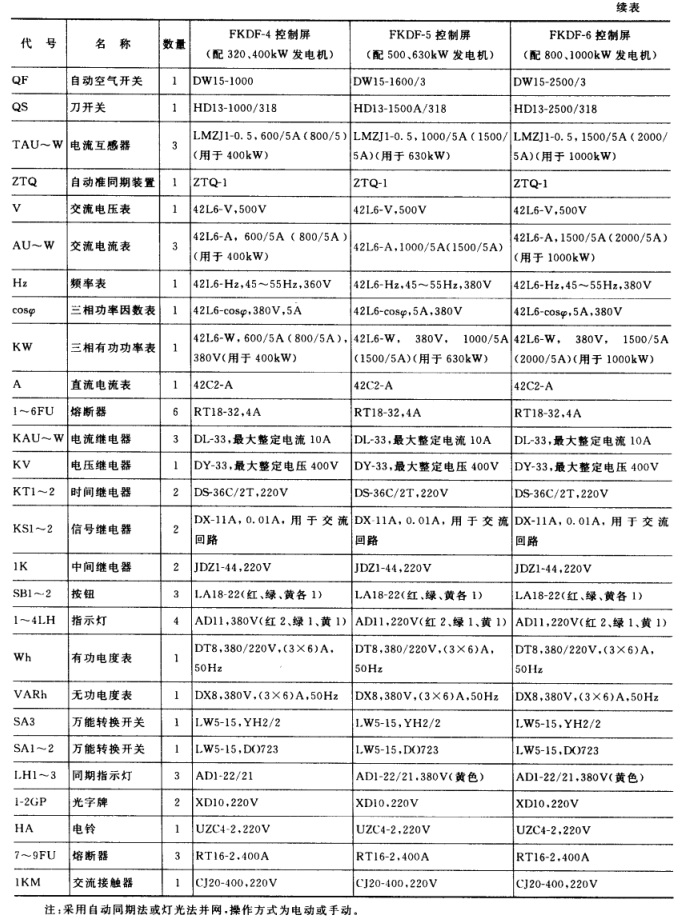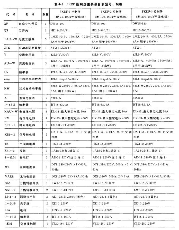 FKDF控制屏為封閉式結(jié)構(gòu),四面用鋼板彎制而成,骨架采用成 型角鋼(或鋼板彎制),屏面上部為 開啟式門,門上裝有功率表、電流表(三相)、功率因數(shù)表、直流電流 表、頻率表、電壓表、信號燈、按 鈕、并聯(lián)裝置和控制開關(guān)等,門內(nèi)裝有電壓繼電器、電流繼電器、時(shí) 間繼電器、信號繼電器、屮間繼電 器.有功、無功電度表和電鈴等,屏的中部裝刀開關(guān)和轉(zhuǎn)換開關(guān)、自 動準(zhǔn)同期裝置,下部裝電流互感器 等。其外形見圖4-1,原理電路圖 見圖4-2,主要設(shè)備見表4-1。