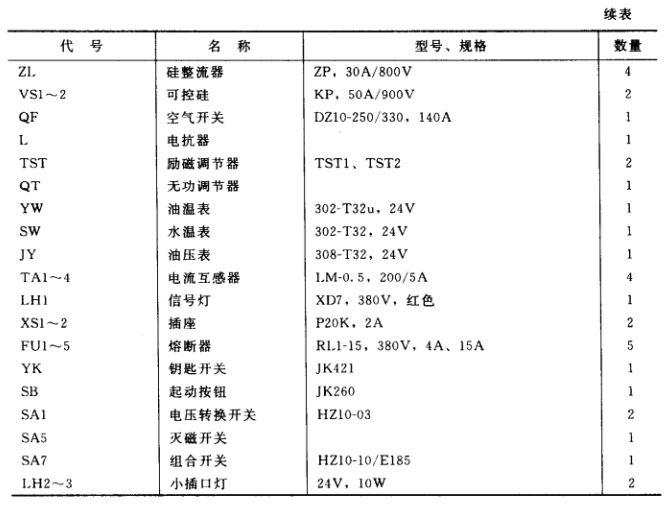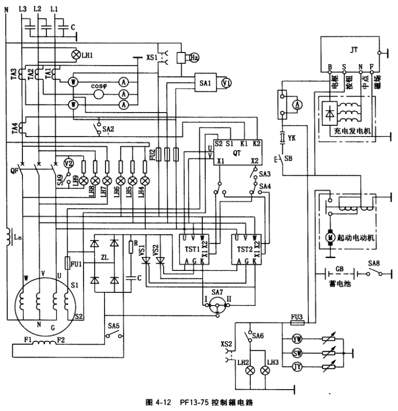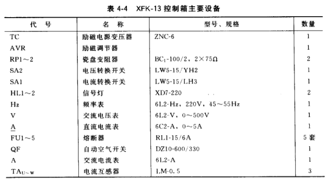 (3)并列運(yùn)行的小型三相發(fā)電機(jī)控制箱電路。圖4-12為PF13-75發(fā)電機(jī)控制箱電路, 主要增加了并列運(yùn)行部分和監(jiān)視儀表,其主要元器件型號、規(guī)格見表4-5。