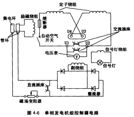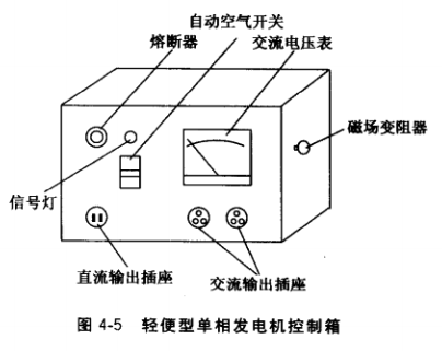 (1)輕便型單相發(fā)電機(jī)組控制箱電路。 圖4-6為國產(chǎn)單相發(fā)電機(jī)控制箱電路圖,一般有熔斷器、交流插座和電壓表、 送電信號燈,通常設(shè)有直流插座及 磁場變阻器。若發(fā)電機(jī)勵磁采用負(fù) 序磁場無刷勵磁,就不裝磁場變 阻器。