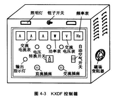 發(fā)電機(jī)組控制箱主要用于移動 式或容量較小的發(fā)電機(jī)的控制、測 量、保護(hù)和送配電,一般為封閉式 金屬結(jié)構(gòu),用優(yōu)質(zhì)鋼板沖壓、焊接而成。它經(jīng)減震器安裝在發(fā)電機(jī)背上,與發(fā)電機(jī)組成一體。圖4-3為 KXDF發(fā)電機(jī)控制箱,面板上裝有 電流表、電壓表、頻率表、功率表、按鈕、指不燈和自動空氣斷路器(空氣開關(guān))的操作機(jī)構(gòu),可方便地監(jiān)測發(fā)電機(jī)運(yùn)行情況并進(jìn)行操作。控制箱側(cè)面還裝有磁場變阻器,供調(diào)節(jié)發(fā)電機(jī)電壓或無功。控制箱面板上設(shè)置儀表的多少隨發(fā)電機(jī)的容量不同和用戶要求不同而不同。有的沒有功率表,有的只裝電流表和電壓表、頻率表,最簡單的只裝一只電壓表。發(fā)電機(jī)的勵磁方式不同, 用于調(diào)節(jié)發(fā)電機(jī)電壓的設(shè)備也不同,除上述 用的磁場變阻器外,有的用電抗器,電壓調(diào) 整率高的則用自動勵磁調(diào)節(jié)器(AVR)。