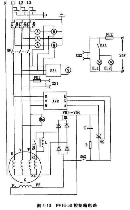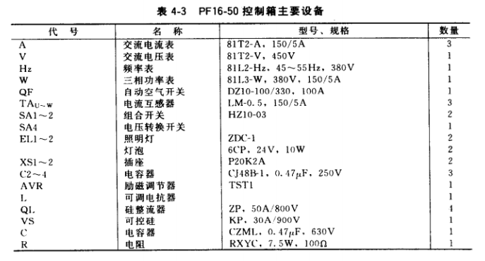 各廠家發(fā)電機(jī)組控制箱電路圖一般大同小異,不同之處主要在于勵磁系統(tǒng)及裝設(shè)的電工儀表的多少。圖4-10、圖4-11分別為PF16-50、XFK-13控制箱電路,其主要元器件分別見 表4-3和表4-4。