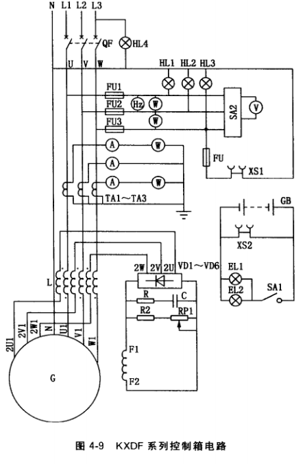 (2)單機(jī)運(yùn)行的小型三相發(fā)電機(jī)組控制箱電路。圖4-9為KXDF 系列低壓發(fā)電機(jī)控制箱電路,其主 要元器件型號、規(guī)格見表4-2,其中 三相交流電主要經(jīng)過自動空氣開關(guān)QF接至接線柱(容量較大的則直接由QF輸出端引出)輸出,另外還有220V交流插座 XS1和24V直流插座XS2。直流插座和照明燈由蓄電池供電。為了監(jiān)測發(fā)電機(jī)的絕緣情況, 配有3只絕緣指示燈(HL1?HL3)。從圖中可看出,發(fā)電機(jī)采用電抗變流復(fù)合式相復(fù)勵勵 磁。發(fā)電機(jī)電壓和由裝在控制箱內(nèi)的磁場變阻器RP1進(jìn)行調(diào)節(jié)。另外有6只電工測童儀表 (3只電流表、1只電壓表、1只頻率表、1只功率表)用于監(jiān)測發(fā)電機(jī)的運(yùn)行。
